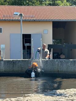 Auf der Kläranlage in Kleinzschepa wurde am Dienstag, den 06.08.2024 das Belebungsbecken gereinigt und notwendige Instandhaltungsmaßnahmen durchgeführt. Dabei kamen Industrietaucher zum Einsatz. Durch die Taucher konnten die Arbeiten durchgeführt werden, ohne dass das Becken abgelassen werden musste. Dadurch war die Kläranlage ununterbrochen in Betrieb.
