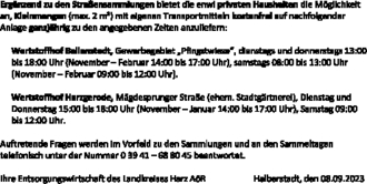 Wertstoffhof Ballenstedt, Gewerbegebiet „Pfingstwiese“, dienstags und donnerstags 13:00