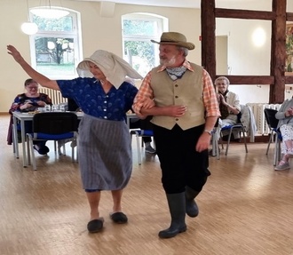 Im Oktober trafen sich die Reinstedter Seniorinnen und Senioren zu einem ganz besonderen Kaffee-Nachmittag. Das Organisationsteam des Projektes „Route 60+“, das gegenwärtig im VHS-BILDUNGSWERK Aschersleben umgesetzt wird, hatte ein echtes Highlight mitgebracht. Die „Froser Modekiste“ war zu Gast. Das sind einige Damen und Herren aus Frose und Umgebung, die hobbymäßig Mode vergangener Jahrzehnte präsentieren. Garniert wird das alles durch die humoristische Moderation der Leiterin der Truppe, Margit Meyer. So waren bei den lockeren Vorführungen immer wieder Einwürfe aus dem Publikum zu hören wie „Das hatte meine Oma auch an“ oder ganz zum Schluss, als die in der DDR allseits beliebten Dederon-Kittelschürzen gezeigt wurden: „Die habe ich heute noch zu Hause im Schrank!“ Die kleine Reise in die Vergangenheit war für alle sehr kurzweilig und unterhaltsam.