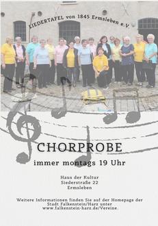 Wir proben immer montags um 19.00 Uhr im Haus der Kultur, Siederstr. 22 in Ermsleben, und jeder, der Interesse hat, kann gerne vorbeikommen und einmal zuhören und vielleicht mitsingen.