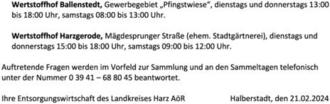 Wertstoffhof Ballenstedt, Gewerbegebiet „Pfingstwiese“, dienstags und donnerstags 13:00