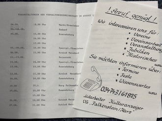 Im Sommer 1995 bekam ich einen Brief vom Arbeitsamt, ich könne mich im Rathaus Ermsleben als Mitarbeiterin des Kulturanzeigers im Rahmen einer ABM-Maßnahme bewerben. Klaus Wycisk, damaliger Bürgermeister der Verwaltungsgemeinschaft „Falkenstein/Harz“, lud einige Bewerber zu einem Vorstellungsgespräch ein. Ich wurde dabei unter anderem gefragt, ob ich mir zutrauen würde, für das Amtsblatt zu schreiben. „Es gibt nichts, was man nicht lernen könnte und geschrieben habe ich schon immer ganz gerne“, so meine Antwort. Dorothea Arnold und ich wurden schließlich ausgewählt.