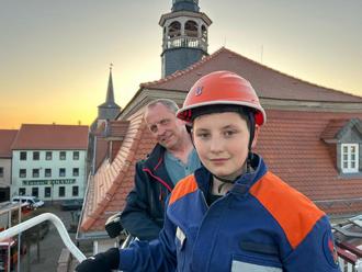 Ein besonderes Highlight war am Freitagabend, den 28.03.2025 die Rettung von Bürgermeister Rico Röse und Stadtwehrleiter Guido Hildebrandt aus dem Dachgeschoss des Rathauses. Die Drehleiter wurde auf der gesperrten Straße in Stellung gebracht und beide aus gut 20 Metern Höhe „gerettet“ und nach unten befördert. Dieses besondere und ereignisreiche Training wird für den Feuerwehrnachwuchs alle zwei Jahre durchgeführt – besonderer Dank gilt hier allen Kameraden die von der Organisation bis Durchführung tatkräftig unterstützt haben.