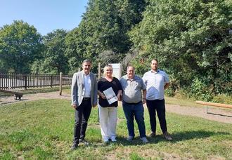 Foto 05.09.2024, Spielplatz Gartenhaus OT Pansfelde (von links: Landrat Landkreis Harz-Herr Balcerowski, Stv. Ortsbürgermeisterin Pansfelde -Frau Bialke, Bürgermeister Stadt Falkenstein/Harz - Herr Röse, SB Hoch- und Tiefbau Stadt Falkenstein/Harz- Herr Hollas