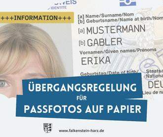 Für das Einwohnermeldeamt der Stadt Falkenstein/Harz gilt daher bis auf Widerruf, dass Passfotos auf Papier auch weiterhin Gültigkeit haben.