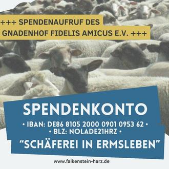 Auf Initiative der Stadt Falkenstein/Harz haben wir ein Spendenkonto für die Schäferin und ihre Schafe eingerichtet. Sie können mit Ihrer Spende das Leben der Schafe und die Zukunft der Schäferei in Ermsleben retten.