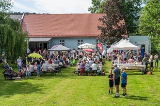 Die Vorbereitungen liefen mit dem Verkauf der Tische an. Die waren ruck, zuck weg. Ein Teil war den Sponsoren und Ehrengäste vorbehalten. Schon sehr früh am Morgen traf sich eine Gruppe von Leuten und stellte die Bierzeltgarnituren nach Plan auf. Die Tische wurden eingedeckt, versehen mit einem Blumengruß, einer Kanne Kaffee, Kondensmilch, Zucker, Marmelade, Honig und Brötchen. Dazu konnte man auf der Terrasse noch Kuchen, Melone, Apfelsaft und Rührei bekommen. Gegen 8:30 Uhr füllte sich der Platz. Alle hatten Geschirr und allerlei Essbares im Gepäck. Viele kamen mit Sonnenschirmen oder Pavillons, denn die Ansagen vom Bürgermeister, alle sollten aufessen, damit wir schönes Wetter bekommen, hatte gefruchtet. Es war schönes Wetter, somit die beste Voraussetzung für eine gelungene Veranstaltung. Musikalisch begleitete der Posaunenchor aus Nachterstedt das Frühstück und wurde später von der Dorfcombo abgelöst.