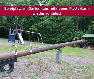 Am Gartenhaus in Pansfelde können Kinder jetzt wieder unbeschwert spielen: Der sanierte Spielplatz verfügt über einen neuen Kletterturm mit Rutsche, Schaukel und Fallschutz. Auch eine farbenfrohe Marienkäfer-Federwippe lädt zum Ausprobieren ein.