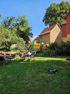 Es war ein sehr schöner, auf die anwesenden Kinder bezogener Gottesdienst. Während des Gottesdienstes konnte man erfahren, was den anwesenden Kindern in der Schule Freude macht und was nicht. Auch die Erwachsenen durften sich einbringen, denn auch bei ihnen läuft nicht immer alles wie gewünscht. Eine Geschichte vom Wachstum gab den eigenen Erfahrungen Raum. Nach dem abschließenden “Vater unser„ begaben sich alle hinüber in den Pfarrgarten. Hier waren Tische und Stühle gestellt, mit Blumen, kleinen Süßigkeiten und kleinen Zuckertüten geschmückt. Auf die Kinder wartete eine Hüpfburg, die sofort in Beschlag genommen wurde. Wer Lust hatte, konnte sich das Gesicht schminken lassen. Die Erwachsenen hielten lieber die Hände dafür hin. Für alle gab es Würstchen vom Grill, ein paar Salate sowie Kaffee und Kuchen als Nachtisch. So ließ es sich gut verweilen im idyllischen Pfarrgarten.