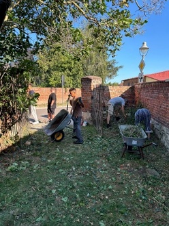 Den Aushängen und dem Aufruf im Amtsblatt folgten allerlei Einwohner, Erwachsene aber auch Kinder. Sie brachten ihr Handwerkszeug sowie Schubkarren mit und machten sich ans Werk. Gemeinsam mit Pfarrer Schmidt wurde das Efeu von der Mauer entfernt, der Kompost in einen bereitstehenden Container verbracht, Büsche verschnitten, Beete gepflegt, Rasen gemäht. Wie heißt es doch so schön, viele Hände, schnelles Ende. So verwandelte sich der Kirchgarten nach und nach wieder in ein sehr ansehnliches Fleckchen Erde. Nach getaner Arbeit war noch Zeit zum Verweilen auf den Bänken im Garten bei Kaffee und Kuchen. Dass hatte man sich verdient.