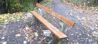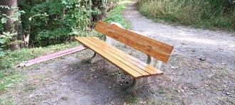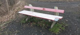 Nun trug es sich zu, dass diese Bank in die Jahre kam und alterte. Eines Tages zog eine Räuberbande durch die Wälder und kam an der roten Bank vorbei; diese war dem Räuberhauptmann ein Dorn im Auge und die Bank wurde zerstört. Daraufhin waren die Bewohner des Pflegeheimes sehr traurig, denn man hatte ihnen die Möglichkeit genommen, auf ihrem Rundweg zu rasten und in so mancher schönen Erinnerung zu leben. Zwei Heinzelmännchen nahmen sich der Sache an und erneuerten diese Bank im August des Jahres 2023 - sehr zur Freude der Heimbewohner.