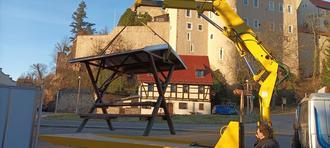 Der Transport übernahm die Firma Auto Korndörfer aus Prießnitz. Nun wurde die Wanderhütte am idyllischen Waldbad in Prießnitz, die sehr gerne besucht wird, ertüchtigt und erhielt ein neues, natürliches und wetterfestes Dach. Diese Reparatur wurde durch die Kameraden der Prießnitzer Feuerwehr realisiert. Notwendig wurde diese Maßnahme, da das alte Dach schwächelte, sich die Dachpappe auflöste und die Traufbleche zur Gefahrenquelle geworden waren.
