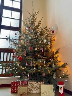 Auch dem Hausmeister Herrn Kwiezinski sowie seinem Gehilfen Herrn Heckel gilt ein großer Dank für das Aufstellen des Baumes und das Anbringen der Lichterkette.Der beleuchtete und von den Kindern geschmückte Baum ist seit vielen Jahren gute Tradition. Nun erfreut er Groß und Klein mit seinem festlichen Schein.