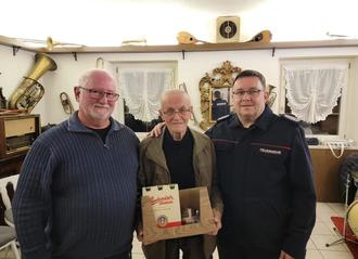 Zur letzten Probe unseres Blasorchesters im Schützenhaus Frohburg, überreichte unser Wehrleiter Lars Kupfer und der Leiter des Blasorchester Andreas Kupfer, dem Kamerad Erwin Röhr, welcher seit dem 01.02.1948 Mitglied in der Feuerwehr Frohburg ist, ein Präsent für 76 Jahre treue Mitgliedschaft. Er ist damit der älteste Kamerad der Frohburger Wehr. Erwin war bis zur Wende in der Betriebsfeuerwehr der damaligen Wäscheunion in Frohburg tätig und ist seit 1958 auch Mitglied des Blasorchesters unserer Wehr.