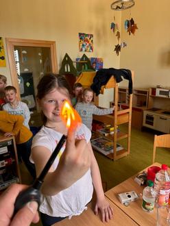 Am darauffolgenden Dienstag war endlich mal wieder ein Experimentiertag. Wir haben Vulkane ausbrechen lassen, ängstlichen Pfeffer beobachtet, Regenbögen auf Papier entstehen lassen, Lavalampen hergestellt und uns mit den Eigenschaften des Wassers beschäftigt. Absolutes Highlight waren die brennenden Finger und andere Experimente mit Feuer (natürlich brannten die Finger nicht wirklich, sondern nur das Gas im Schaum).