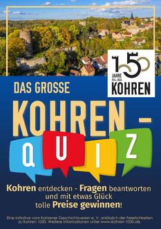 Wissen Sie, seit wann im Haus des heutigen Töpferhauses Arnold getöpfert wird? Oder welche Berühmtheit 1018 in Kohren zu Besuch war? Wer war Ludwig Knorr, der am Kohrener Markt 30 aufgewachsen ist? Diese und weitere 15 Fragen werden im großen Kohren-Quiz gefragt. Die Antworten finden Sie und Ihre Kinder ganz leicht bei einem gemütlichen und vergnüglichen Erkundungsrundgang durch Kohren. Zu manchen Fragen können Sie einfach Kohrener befragen. Sich am Quiz zu beteiligen, macht nicht nur Spaß, Sie können auch tolle Preise gewinnen, z. B. einen Laptop oder einen Gutschein für etliche Fahrten mit der Sommerrodelbahn u. v. m. Das Quiz gibt es im Töpferhaus Arnold, im Töpfermuseum und zu den Veranstaltungen. Bis 16. September muss es bei der Bäckerei Reiße in Kohren oder im Töpfermuseum abgegeben werden – natürlich ausgefüllt mit den richtigen Antworten.