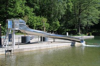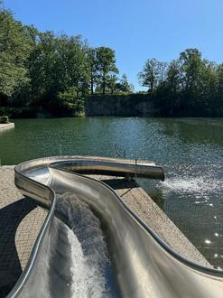 Im Moment kann die neue Rutsche aufgrund von fehlendem Regen und dem damit einhergehenden niedrigen Wasserstand leider noch nicht genutzt werden. Dies wird sich aber hoffentlich in den nächsten Wochen ändern.