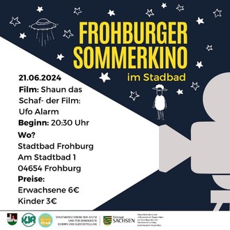 Erstmalig findet auch ein Sommerkino unter freiem Himmel statt. Organisiert durch die Jugendbeteiligung Frohburg werden insgesamt 3 Filme gezeigt. Los geht es am 21.06.2024 mit dem Film "Shaun das Schaf – Der Film: UFO-Alarm". Einlass ist um 20:30 Uhr und kostet 6 € Eintritt für Erwachsene und 3 € für Kinder. Weitere Termine: 13.07.2024 – "Oskars Kleid" und 27.07.2024 – "The Peanut Butter Falcon".