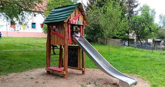 Nach der diesjährigen Inspektion in der KiTa Kinderland Prießnitz wurde die in die Jahre gekommene Holzeisenbahn auf der Freifläche aus Sicherheitsgründen nun vollständig entfernt. Dank freigewordener Mittel der Stadtverwaltung konnte ein Ersatzspielgerät angeschafft werden. Nach der Einholung von drei Angeboten fiel die Wahl auf ein Spielhaus mit Edelstahlrutsche im Wert von 7.973 € von der Firma Holzwelten. Die Konstruktion besteht aus hochwertigem Robinienholz und lädt zum Klettern und Rutschen ein.