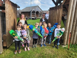 In der Herberge angekommen, durften die Kinder ein Westernfort erobern und sich richtig austoben. Am späten Nachmittag kamen die Eltern dazu. Die Vorschulkinder trugen ein Programm vor, welches sie lange Zeit geprobt hatten. Im Anschluss ging es zur feierlichen Übergabe der Zuckertüten. Mit der Lösung von kleinen Rätseln ergatterte sich jedes Kind seine persönliche Zuckertüte und war äußerst stolz. Als gemeinsamen Abendausklang wurde nun gegrillt. Die Eltern richteten mit ihrem Kind den Schlafplatz im Heu ein und dann verabschiedeten sie sich. Als Abschluss des Tages ging es nun noch zur Nachtwanderung.