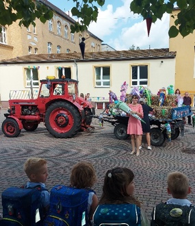 Am Sonntag, dem 3. August 2024 war es wieder einmal so weit. 61 kleine ABC-Schützen warteten gespannt auf ihre Zuckertüte. Nach einer Veranstaltung in der Aula und einem kurzen Aufenthalt im Klassenzimmer, ging es auf den Schulhof. Dort erwartete die Kinder eine große Überraschung. Herr Große vom Oldtimerverein Kohren-Sahlis brachte mit seinem Traktor die langersehnten Zuckertüten, die von den künftigen Klassenleiterinnen und Horterziehern überreicht wurden.