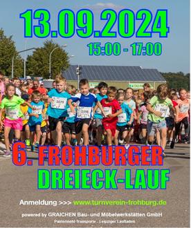 „Am verflixten Freitag, den 13. September 2024, findet der 6. Frohburger Dreieck-Lauf statt, veranstaltet vom Frohburger Turnverein e.V. Allen Laufbegeisterten bietet sich wieder die Möglichkeit, ihre sportliche Form auf dem originalen Kurs der Motorradrennstrecke Frohburger Dreieck zu testen. Dabei wird Starmoderator Stefan Bräuer für die richtige Betriebstemperatur der Laufgemeinde sorgen. Los geht es 15:00 Uhr mit dem 300-m-Bambinilauf. Ab 15:15 Uhr werden im 1,5-km-Kinder- und Jugendlauf zunächst die Mädchen und anschließend die Jungs an den Start gehen. Hier geht es neben der Einzel- auch wieder um die Teamwertung (mindestens 6 Mädchen/Jungs pro Team). Beim 5-km-Lauf gibt es neben der Einzelwertung erstmals eine 3er-Mix-Teamwertung (weibl./männl. gemischt).