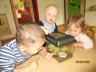Täglich zum Morgenkreis begrüßten die Kinder fröhlich die Schnecken, sie wurden mit großem Interesse beobachtet und mit frischem Wasser und knackigem Salat versorgt.