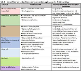Um die Umweltauswirkungen exakter ermitteln zu können, werden den Schutzgütern Umweltfunktionen zugeordnet, welche aus den Umweltzielen der Gesetze, Verordnungen und übergeordneten Planungen abgeleitet wurden (beiliegende Tabelle 3). Die der Umweltprüfung zugrundeliegenden Umweltziele, bezogen auf die einzelnen Schutzgüter und ihre Umweltfunktionen, werden im Umweltbericht zum Bebauungsplan „Energiepark Bohrau“ sowie im Landschaftsplan der Stadt Forst (Stadt) ausführlich erläutert.