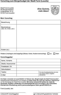 Dieses Formular ist auf der Homepage der Stadt Forst (Lausitz) einsehbar und kann ausgedruckt werden. Vorschläge können auch mündlich zur Niederschrift bei der Stadt Forst (Lausitz) eingereicht werden.
