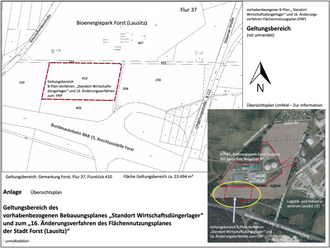 Um dem Entwicklungsgebot des § 8 Abs. 2 BauGB zu entsprechen, wird im Parallelverfahren zum vorhabenbezogenen Bebauungsplan „Standort Wirtschaftsdüngerlager““ ein vorbereitendes Bauleitplanverfahren mit der Bezeichnung „16. Änderungsverfahren zum Flächennutzungsplan der Stadt Forst (Lausitz)“ durchgeführt.