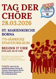 Ein sichtbares Ergebnis dieses Engagements ist der „Tag der Chöre“ am 28. März, der im Jubiläumsjahr „775 Jahre Borna“ in der St. Marienkirche auf dem Martin-Luther-Platz in Borna stattfindet. Die Veranstaltung wird von der Stadt Borna in Zusammenarbeit mit der evangelisch-lutherischen Kirchgemeinde Borna und dem Leipziger Chorverband organisiert. Neun Chorensembles aus Borna und der Region gestalten an diesem Abend ein abwechslungsreiches Programm und geben Einblicke in die Vielfalt der regionalen Chormusik. Zu hören und zu sehen sind: die Gemischten Chöre Frohburg, Mölbis und Neukieritzsch, die Kantorei Borna, der Neuapostolische Chor Borna, die Männerchöre Borna, Eula und Benndorf sowie der Frauenchor Kitzscher.