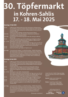 | 10 Uhr | Eröffnung des Töpfermarktes durch die Schirmherren, Bürgermeister Karsten Richter und Ortsvorsteher Siegmund Mohaupt sowie die beiden ortsansässigen Töpfermeisterinnen Gundula Müller und Karina Werner (Festbühne Markt) Andacht mit Pfarrer Ellinger und dem Posaunenchor (Markt) | ||