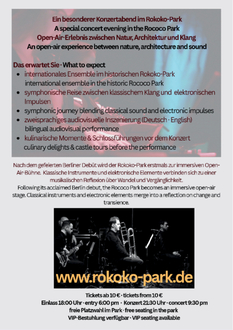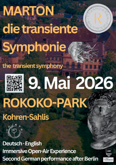 Das internationale Künstlerensemble MARTON präsentiert sein audiovisuelles Konzertprojekt „Die transiente Symphonie / The Transient Symphony“ unter freiem Himmel. Die Aufführung verbindet klassische Instrumente, moderne Klangwelten und visuelle Projektionen zu einem eindrucksvollen Gesamterlebnis. Musik, Sprache und Bild verschmelzen dabei zu einer künstlerischen Reise über Vergänglichkeit, Wandel und menschliche Verbundenheit über kulturelle Grenzen hinweg. Das Konzert wird vollständig zweisprachig (Deutsch / Englisch) gestaltet.
