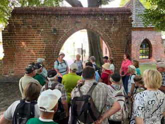 Wanderfreundin Bärbel Vogel gibt uns erste Einblicke zum Kloster Lehnin vor dem Eingangstor zum Kloster.