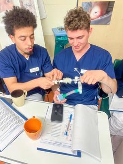 Zwei Azubis machen sich mit Gerätschaften der Intensivmedzin vertraut