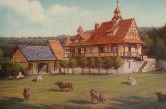Unner heitige Oasicht vo 1924 is net weit weg drvoa. Hinten stieht drauf: „... ist das idyllisch auf bewaldeter Höhe unweit Falkenstein gelegene Landhaus des Kammerherrn Osw. V. Trütz(sch)ler, Freiherr zum Falkenstein auf Falkenstein.“