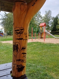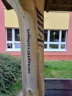 An einem Herbstwochenende im September verschandelten Unbekannte das Sitzeck auf dem Grundschulspielplatz. Die Täter können ihre Tat wiedergutmachen, indem sie sich bei der Grundschule oder in der Gemeinde melden und ihre Schriften selbstständig entfernen. Leider ist es nicht das erste Mal, dass es zu unnötigen Verschmutzungen kam.
