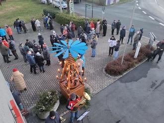 Die beiden öffentlichen Drehtürme wurden nun schon zum dritten Mal angeschoben- oder besser wie dr Vugtländer sogt- oahgeschum! Los ging es am Drehturm der Freiwilligen Feuerwehr, wo sich bereits viele Grünbacher zu einem Becher Glühwein einfanden und den Klängen des Posaunenchors der evangelischen Gemeinde lauschten.