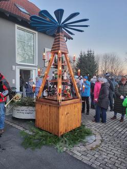 Dann zogen alle durch die bereits zauberhaft geschmückte Krumme Straße zum "Hotel Bayerischer Hof". Dort überraschten die Gäste ein liebevoller kleiner Weihnachtsmarkt mit Budenzauber, Lagerfeuer und frischen Duft von Bratwurst, Soljanka und heißen Getränken. Unterstützt durch die Gemeinde Grünbach und einigen Vereinen unserer Dorfgemeinde wurde auch hier der Drehturm feierlich in Gang gesetzt und kann nun für die nächsten Wochen seine Runden drehen. Dabei wurde auch ein tolles Festprogramm durch Kinder der KITA und durch Weihnachtsmusik des Posaunenchors gezeigt.