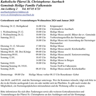 | Sonntag 05.01. | 08.45 Uhr | Heilige Messe anschl. Kirchenkaffee | |