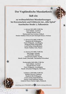 Nicht so gut besucht war die Mundartveranstaltung am 2. Advent. Viele Besucher, die Plätze reserviert hatten, erschienen nicht. Es lasen Manfred Zill aus Willitzgrün, Gerd Conrad aus Schneidenbach, Wolfgang Wild aus Klingenthal und Doris Wildgrube aus Arnoldsgrün. Den musikalischen Part hatte Mathias Götz aus Plauen übernommen. Als gute Idee erwies sich, dass er die Liedtexte mitgebracht und im Publikum verteilt hatte, sodass alle Besucher mitsingen konnten. Alle Autoren trugen ausschließlich eigene humorvolle, aber auch nachdenklich stimmende Gedichte und Geschichten vor. Erinnerungen an die eigene Kindheit, das Wetter sowie aktuelle Themen wurden dabei berührt. Auch am 4. Advent lädt der Vogtländische Mundartkreis zu Mundart und Musik ins weihnachtlich geschmückte „Alte Spital“ ein. Dann lesen Jörg Fiegge aus Oelsnitz, Axel Pfeifer aus Ellefeld und Gerold Schwenkbier aus Werda. Die musikalische Begleitung übernimmt Frank Gottschalk aus Thermalbad Wiesenbad mit Bandoneon und Konzertina. Freuen dürfen sich die Besucher zudem auf eine kleine erzgebirgisch-vogtländische Premiere. Nach einer Pause über die Feiertage wird die Veranstaltungsreihe mit „Hochneujahr im Alten Spital“ am Dienstag, dem 06. Januar 2026 um 17.00 Uhr fortgesetzt. Es werden Anne Solitair, Thorald Meisel und Doris Wildgrube lesen. Als Musiker konnte Sebastian Wildgrube aus Bad Elster gewonnen werden.
