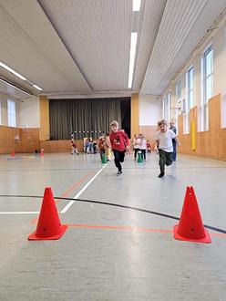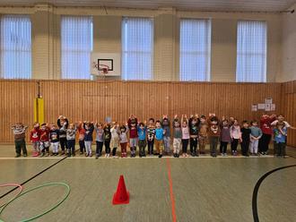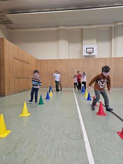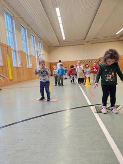 Zu unserem „Tier-Winter-Sportfest“ haben wir uns wie Tiere bewegt und uns im Wettspiel ausprobiert. Wir rannten wie ein Leopard so schnell, watschelten wie ein Pinguin um Kegel, hüpften wie ein Känguru und balancierten wie der Eisbär auf einer Eisscholle.