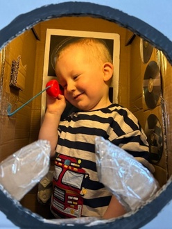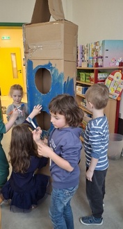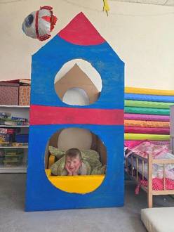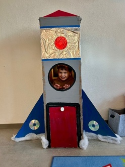 Es wurden Planeten, Außerirdische und Ufos gebastelt. Aus großen Kartons haben wir Raketen gestaltet, in die wir sogar richtig einsteigen konnten. Das Lied von der Weltraummaus sowie Shiny, der Lichterfee, hat uns die ganze Zeit begleitet.