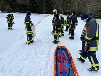 Der Grünbacher Feuerlöschteich und gleichzeitig das Vereinsgewässer unserer Angler boten sich als perfektes Übungsobjekt für diese Ausbildung zur Eisrettung an. Schon lange war die letzte Übung zur Rettung von Menschen auf eingebrochenen Eisflächen her. Nun konnte das Wissen aufgefrischt werden.