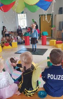 Am Faschingsdienstag war es so weit. Alle Kinder kamen verkleidet in den tollsten Kostümen. Wir frühstückten gemeinsam in den einzelnen Gruppen. Danach hieß es dann „Manege frei“. Die Kinder der Mäusegruppe sprangen über Reifen und krabbelten durch einen Tunnel. Einen flotten Tier-Tanz zeigten uns die Käferkinder. Bei den Igelkindern führte Lea als Zirkusdirektorin durchs Programm. Es traten auf: Zauberer, Clowns, Sänger, Akrobaten, Seiltänzer, Reiterinnen, Jongleure sowie ein Dompteur mit seinen gefährlichen Raubkatzen.