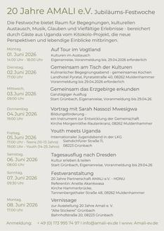 Aus diesem Anlass wird eine Festwoche mit verschiedenen Veranstaltungen organisiert. Dazu sind alle Interessierten herzlich eingeladen, die Arbeit des Vereins näher kennenzulernen und einen Einblick in die vielfältigen Projekte und Aktivitäten von Amali e.V. zu erhalten. Die Veranstaltungen bieten Gelegenheit zum Austausch, zur Information und zum gemeinsamen Feiern dieses besonderen Jubiläums.