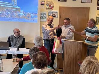 In der anschließenden Diskussion gab es zunächst Grußworte aus Österreich, die an die bereits 33-jährige Partnerschaft erinnerten und eine große Flasche Schnaps überreichten.