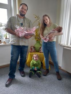 Die kleine Runa Frieda Ficker mit ihrem großen Bruder Artur und ihren Eltern Stephanie und Norman Ficker.