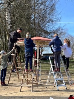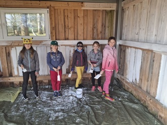 Auch auf dem Schulhof passierte einiges. Der Spielpilz wurde aufwändig restauriert, so dass er wieder in neuem Glanz erstrahlt. Die Holzbänke erhielten einen kompletten Abschliff sowie neuen Anstrich. Für den Sandkasten konnten neue Stämme entrindet werden. Diese müssen jetzt noch trocknen und werden später erneuert. Ebenso konnte der kleine Unterstand vor dem Hort hergerichtet und komplett neu gestrichen werden. Nun steht einem gemütlichen Picknick nichts mehr im Wege.
