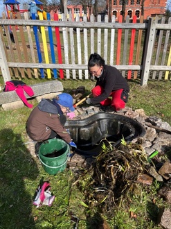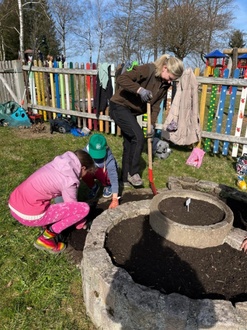 Im Schulgarten erhielt der Unterstand innen einen kompletten Anstrich. Die Kräuterschnecke und der kleine Teich wurden wieder frisch hergerichtet. In den Beeten verschwand das Unkraut und neue Erde füllte sie wieder.